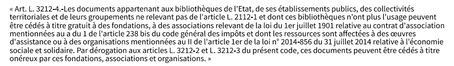 MorganeSol Posté(e) le 7 juin 2024 Posté(e) le 7 juin 2024 Bonjour ! pour la partie légale : « loi relative aux bibliothèques et au développement de la lecture publique » de décembre 2021, dite Loi Robert, demande le passage par une structure de l’économie sociale et solidaire (ESS). Dans les faits, les bibliothécaires peuvent faire des braderies de livres, un don (de livres) à l’association des parents d’élèves, mettre au recyclage ou contacter une structure locale de l’ESS locale. Les conditions de récupération des documents sont à voir au cas par cas avec partenaires, notamment sur le type de documents acceptés et les critères (rayer les tampons et code barre, effacer les références en page d’accueil, enlever les couvertures souples plastifiées....). Voir avec des chantiers de réinsertion, recycleries, écoles avec les projets de récupération/vente de vieux papiers pour financer les sorties des enfants. Sinon voir avec votre BDP ou votre coordination de réseau, pour connaître les noms des acteurs de récupération de documents près de chez vous. Au pire oui le recyclage en sacs jaunes ou à la benne de papier directement ! Bon courage Citer