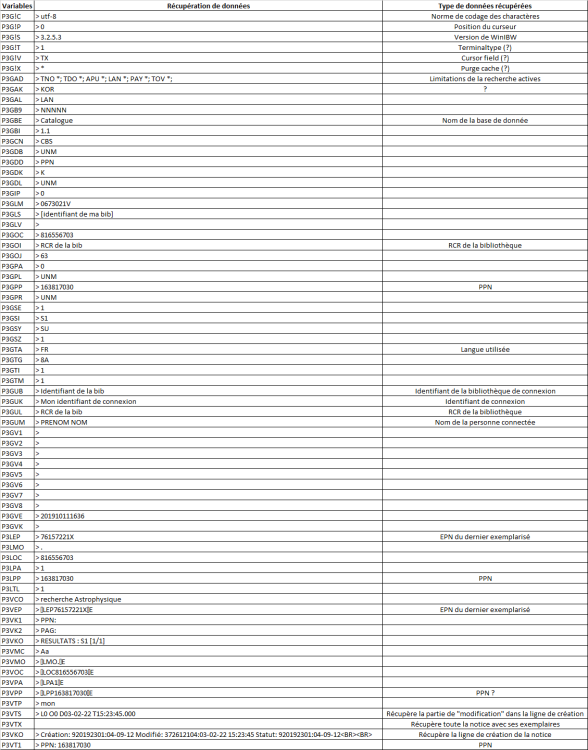 B. Majour Posté(e) le 27 octobre 2022 Posté(e) le 27 octobre 2022 Bonjour Tu as remarqué que sur le fichier concerné tu as les Variables suivantes Var-ID Variable Function A* Current ILL request number PR Current title presentation format SD Current SDI request numberSE Current title set number TA Current language code TI Current title number CBS -> WinIBW3 Variables WinIBW3 uses the following variables sent by CBS to compose a configurable menu caption:Var-ID Variable Function CN CBS host name SY System name BE Database name E07 Screen name (“login”, “database selection”, etc) This variable is part of a screen definition and therefore not a ‘real’ variable. Note: The E07 can be accessed via ‘scr’ instead of ‘P3GE07’, when using the attribute ‘variable’ describe in the section 3.4.12.PP PPN UK User ID (‘key’) UM User name UL User library ID UB User library name https://github.com/abes-esr/winibw-scripts/blob/master/documentation/Scripting_in_WinIBW3.7.0.pdf cliquer sur Download pages 21-22-23 En se basant sur application.activeWindow.variable(“P3GPP”) will get the current PPN, application.activeWindow.variable(“P3GSE”) will get the current title set number, On dirait que c'est bâti comme suit : P3GPP = P3G PP P3GSE = P3G SE scr, c'est certainement pour l'écran buf, pour le buffer en mémoire. Si j'avais le logiciel sous la main, j'essaierais d'afficher SCRPP et BUFPP (pour voir si ça fonctionne) Pour l'identifiant de l'EPN, tu peux essayer P3GUM P3GUL P3GUB soit : application.activeWindow.variable("P3GUL”) application.activeWindow.variable("P3GUB”) Pour voir ce qui se cache sous les termes UM User name UL User library ID UB User library name Je me demande si ce ne seront pas les tiens. Lorsque tu cherches peut-être la bibliothèque ayant créé la notice. A tester pour voir. Citer